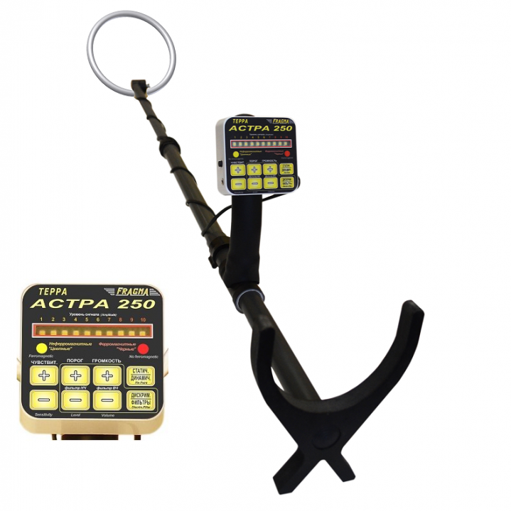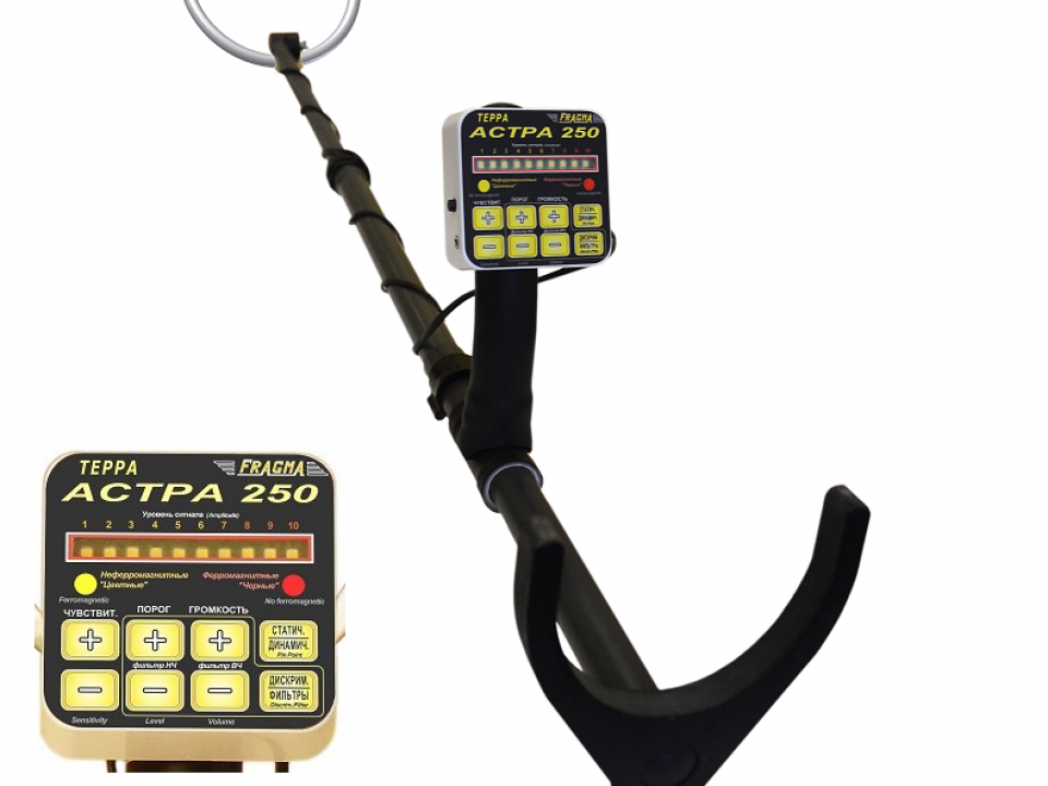 Астра - 250 имеет трехуровневый дискриминатор, и систему дискриминации по размеру объекта. Настройки фильтров позволят пользователю самому выбирать частотную полосу пропускания сигнала (задается нижняя и верхняя частота полосовго фильтра) для динамического режима поиска. Также возможно управление порогом сигнального срабатывания, что дает возможность пользователю добиться рекордных значений чувствительности в грунте и в замусоренной местности. В процессорном блоке встроен динамик звуковой индикации, также прибор имеет выход на наушники. Работа прибора в статическом режиме позволит вам в реальном времени отследить контуры металлического объекта(ов) залегающего под землей, и найти его центр массы. При полностью собранной штанге прибор имеет малые размеры и может применяться для операвтивного досмотра людей и багажа, также стен и ниш. Поисковая катушка прибора (датчик) выполнена в металлопластиковом корпусе, что обеспечивает высокую износостойкость даже при работе по гравию. Как и в других приборах нашего производства датчик полностью водонепроницаемый, т.е. можно осуществлять поиск под водой на глубине до 1 метра не погружая процессорный блок.
